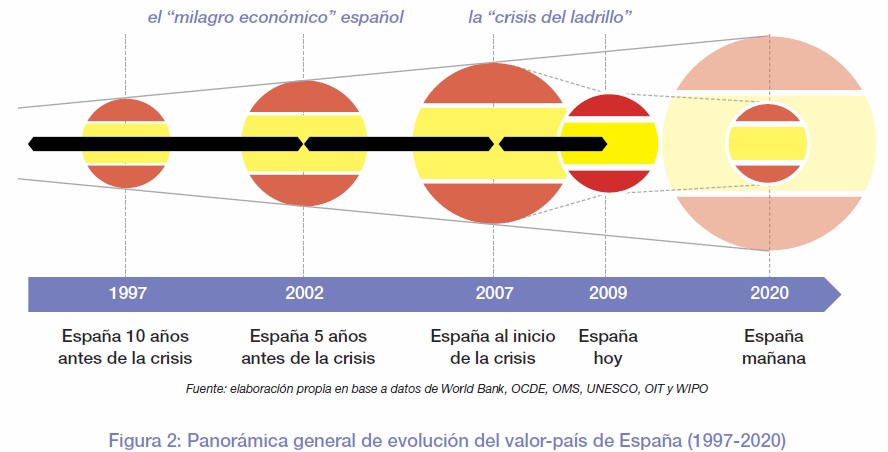 En este sentido, la Figura 2 muestra la evolución del valor-país de España desde 1997 hasta 2009, junto con proyecciones futuras del tipo what-if (qué hubiera pasado si...) hasta el 2020. El valor de España ha crecido al menos desde el año 1997 (esto es, una década antes del inicio de la crisis) hasta el año 2007, en el que se produce un punto de inflexión que da paso a una caída pronunciada que, hasta 2009, retorna el país a valores próximos a 1997 actualizados.