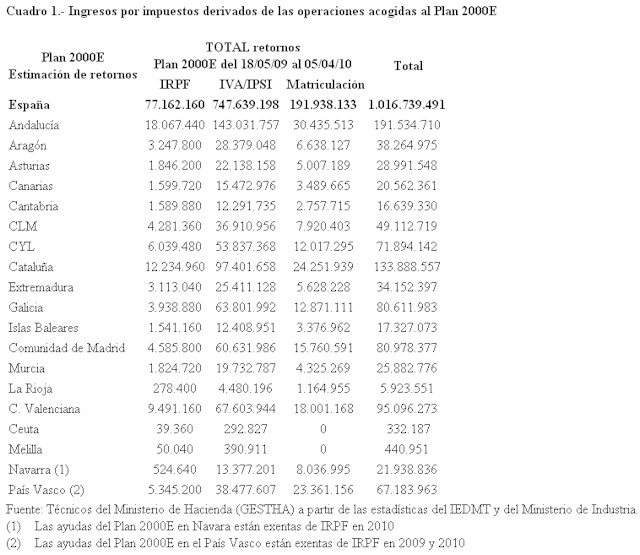 Con estas cifras, Gestha constata que el Plan 2000E le "sale rentable" a las Administraciones Públicas, ya que los ingresos fiscales que genera son muy superiores a las ayudas presupuestadas para el plan de incentivos.