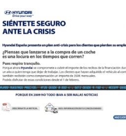 LD (EFE) El director general de Hyundai-España, Diego Gutiérrez Colomer, explicó que esta ayuda se concreta en el compromiso de esta filial de cubrir a fondo perdido el importe de los recibos de la financiación durante un año a todo aquel cliente que pierda su empleo, como mínimo, sesenta días después de la adquisición del coche.