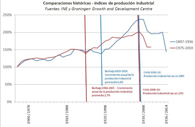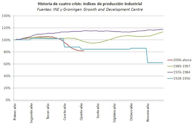 Estas cifras son preocupantes en sí mismas, pero también si se comparan con las que mostraba la industria en las grandes crisis del pasado siglo. El blog Random Spaniard lo ha hecho y la conclusión es que “esta crisis, en España, sólo se puede comparar con la Gran Depresión”.