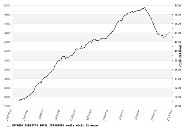 Durante el pasado verano se empezó a ver una esperanzadora recuperación en el número de turistas extranjeros que entraban en España, según las cifras oficiales. Aunque en ningún caso han vuelto a recuperarse las cifras de 2007, sí que llegamos a ver subidas del 4% durante los meses del verano, que fueron perdiendo impulso en octubre y noviembre. Finalmente, diciembre ha cerrado con una preocupante caída del 4,7%.
