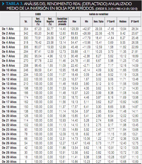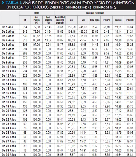 En este caso no es hasta los períodos de 11 años cuando se obtiene una rentabilidad anual positiva en el 100% de los casos estudiados. A partir de ese plazo (11 y más años hasta 30) en el 75% de los casos el rendimiento es superior al 9%.