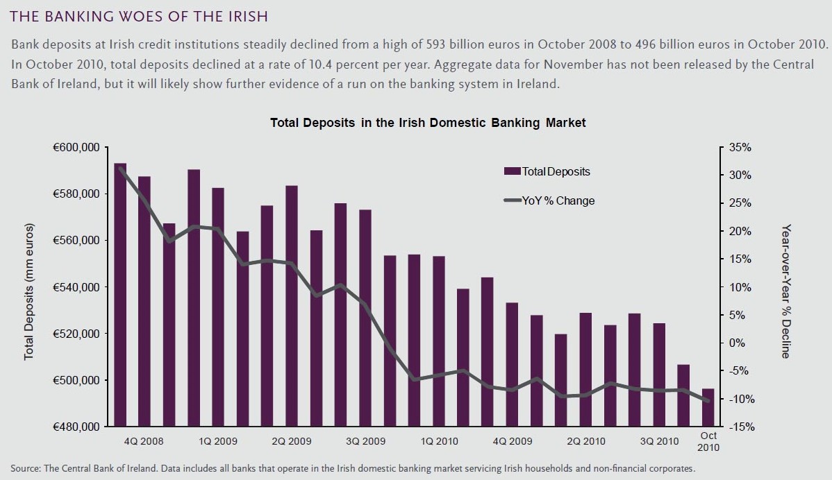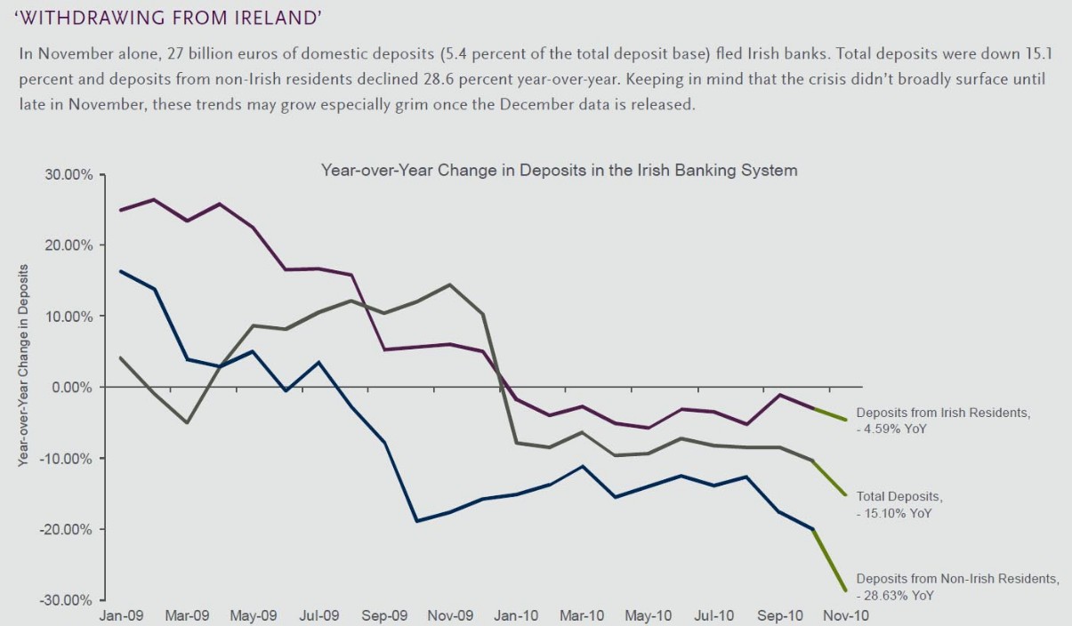 Estos créditos están siendo empleados para que los bancos irlandeses sigan pagando a sus acreedores (evitando así la quiebra) al tiempo que compensan la drástica fuga de depósitos que está sufriendo el sistema desde hace meses. Así, solo en noviembre, se estima que el volumen de depósitos retirados de los bancos del país ascendió a 27.000 millones de euros (el 5,4% del total). El volumen total de depósitos ha caído un 15,1% interanual, mientras que los de los no residentes se desplomaron un 28,6%. Esta tendencia no ha dejado de agravarse.