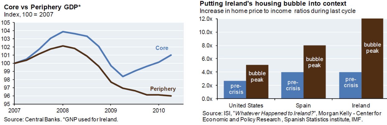 En cuanto a las citadas divergencias entre el centro y la periferia, los analistas del banco destacan el déficit comercial de los PIIGS (Portugal, Irlanda, Italia, Grecia y España), el crecimiento del crédito durante la etapa expansiva, la burbuja inmobiliaria, el estancamiento económico que sufren estos países, así como la tasa de paro respecto a Alemania, el motor de la zona euro.