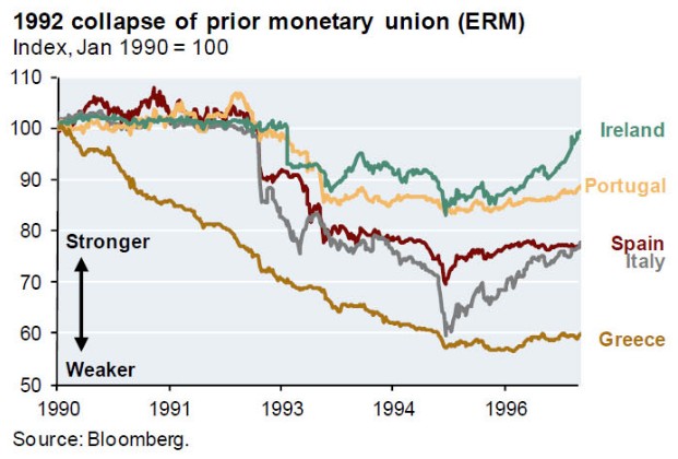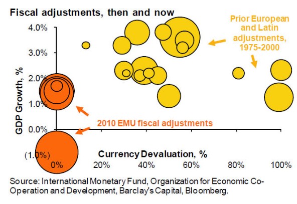 Los países rescatados hasta el momento (Grecia e Irlanda) deberán apretarse el cinturón y realizar los ajustes que impone la "ortodoxia de Maastricht" sin posibilidad de "devaluar su moneda para ayudar a amortiguar el golpe". Aplicar grandes ajustes fiscales sin devaluar supone un fenómeno inédito, en comparación con procesos similares previos en Europa y América Latina. "Nadie (a excepción de Letonia) ha intentado esto antes".
