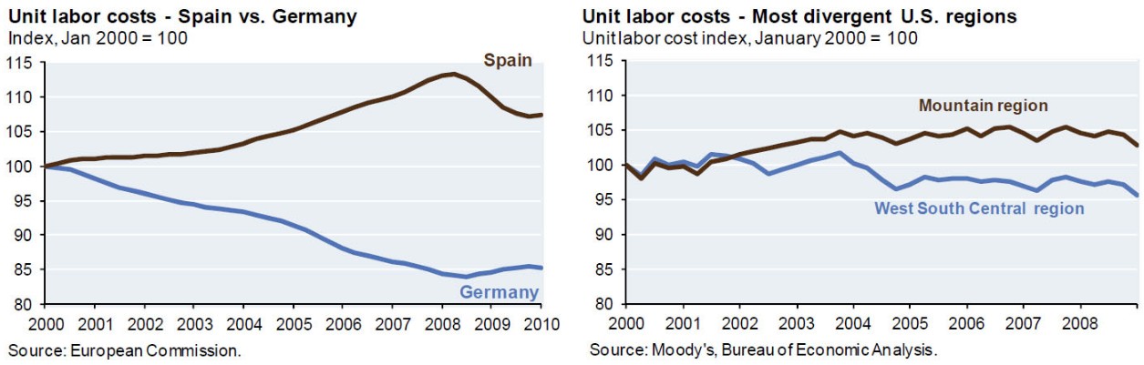 Este problema no es nuevo, ya que existía mucho antes de la llegada de la recesión. En este sentido, la entidad cita un estudio del Instituto de Investigación Económica de Alemania de 2007 que, ya por entonces, alertaba de que el aumento de los costes laborales en algunos países de la zona euro (como Portugal, Grecia e Italia) es muy superior al registrado en los distintos estados de EEUU o las regiones federales alemanas (Länder).