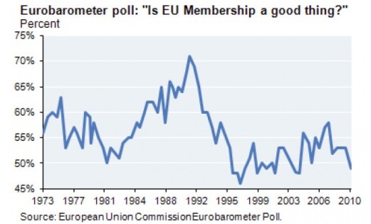 Cembalest, sin embargo, pone el acento en dos puntos que hacen peligrar dicho proyecto de unificación. Por un lado, el apoyo de los ciudadanos a la UE está cerca de sus niveles más bajos desde 1973, según el Eurobarómetro, lo cual dificultará las medidas destinadas a crear un Gobierno único en la zona euro.
