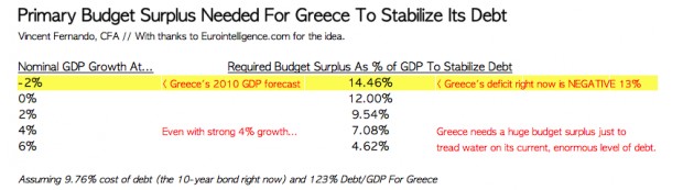 Incluso creciendo a un fuerte ritmo del 4% anual, Grecia precisaría un amplio superávit primario del 7% para mantener intacto su actual ratio de deuda pública respecto al PIB (algo más del 115%) en los próximos años. En la actualidad, el déficit griego se aproxima al 14% del PIB, según la última revisión oficial, con lo que el ajuste presupuestario que debe realizar Atenas para mantener a raya su deuda pública supera el 20% del PIB, y además su economía seguirá sufriendo la recesión en 2010 (una caída mínima del 2%, según su banco central).