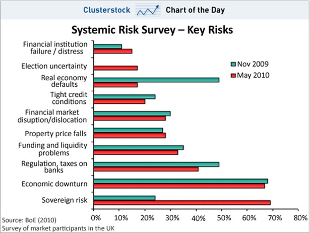 De hecho, según el siguiente gráfico del portal Business Insider, con datos del último Informe de Estabilidad Financiera del Banco de Inglaterra, el riesgo soberano se ha disparado entre noviembre del año pasado y mayo de 2010.