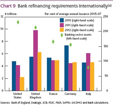Como se observa en el gráfico, la situación de la banca presenta algunas particularidades según de qué países estemos tratando. Los bancos alemanes son quienes se enfrentan a un plazo de maduración más cercano, mientras que el Reino Unido presenta una elevadísima necesidad de refinanciación en 2011.