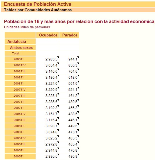 Según este cuadro, que no puede ser discutido por nadie en su sano juicio, la ocupación andaluza en 2009 ha descendido a los niveles de principios de 2005 y el paro se ha duplicado. Así de sencillo y de claro. ¿En qué ha beneficiado los intereses de los trabajadores y empresarfios andaluces aquel VI Acuerdo de Concertación?
