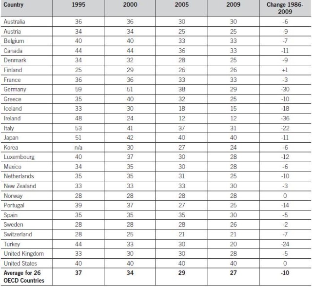 El siguiente cuadro muestra la evolución del Impuesto de Sociedades en los países de la OCDE de 1995 a 2009 (la última columna corresponde a la variación total, y la última fila a la media de los países). El resultado es claro: el tipo MEDIO ha caído 10 puntos (una reducción del 27%).