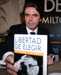 (Libertad Digital) El Hotel Hesperia ha sido el escenario escogido por Gota a Gota para la presentación del libro Libertad de elegir, de Milton y Rose Friedman. El ex presidente del Gobierno, José María Aznar, ha sido el encargado de la presentación, en la que ha hecho una cerrada defensa del liberalismo y ha recordado cómo las políticas del "socialismo simpático" no sólo son responsables de la situación sino que nunca serán la solución a la crisis que atraviesa nuestra economía.