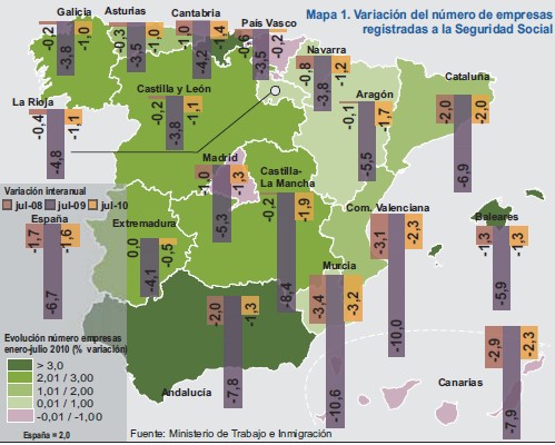 Por otro lado, todas las CCAA, salvo Canarias, Madrid y País Vasco han aumentado su número de empresas de enero a julio de 2010. Con datos acumulados hasta julio de 2010, en lo que va de año, Canarias ha destruido empresas a un ritmo del 1%, Madrid (-0,2%) y País Vasco (-0,1%).