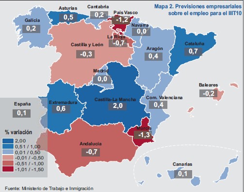 Los empresarios se muestran más negativos en Murcia, donde prevén reducir en 1,3% sus plantillas. Le siguen, País Vasco (-1,2%), La Rioja (-0,7%), y Andalucía (-0,7%). Más optimistas son las previsiones de los empresarios castellano manchegos, que barajan un aumento del 2% del empleo, seguidos de Cataluña (0,7%), Extremadura (0,6%) y Asturias (0,5%).