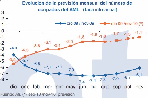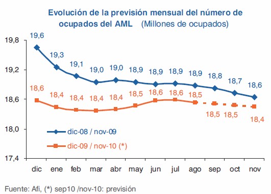 Dada la desfavorable estacionalidad para el empleo que caracteriza a la última parte del año, el Indicador que elaboran estos organismos prevé que se produzca una caída de la ocupación en noviembre hasta los 18,44 millones de ocupados, con un ritmo interanual de caída del empleo del -1,1%.