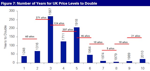 En la gráfica (pinchar en la imagen para ampliar) aparecen resaltados el número de años que se tarda en doblar los precios en Reino Unido, y se puede observar claramente que desde la conclusión de la Primera Guerra Mundial estamos en medio de la mayor inflación continuada de la historia: en 91 años los precios se han multiplicado por 32.