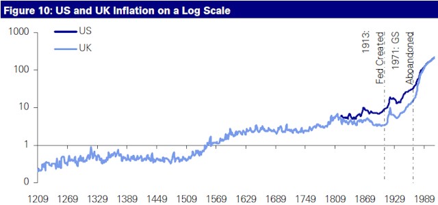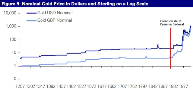 Es significativo también cómo el precio del oro se ha mantenido más o menos estable a lo largo de la historia, hasta que se ha producido una desbocada expansión crediticia después de la creación del Sistema de la Reserva Federal.