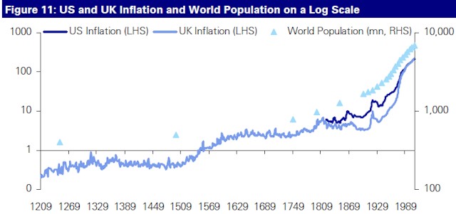 Por lo tanto, durante la segunda mitad del siglo XX han coincidido dos variables tradicionalmente inflacionarias: el crecimiento demográfico y la expansión monetaria orquestada por los bancos centrales, especialmente después del abandono del patrón oro en 1971. La suma de estas dos variables ha provocado la inflación de las úlitmas décadas
