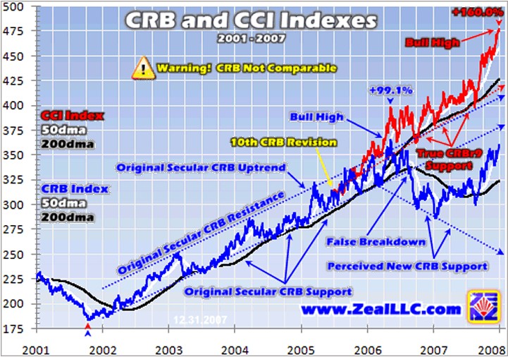 Atendiendo sólo a la paridad con la demografía, la inflación debería ser en cualquier caso muy inferior a la desarrollada durante el último medio siglo y más acorde con la de comienzos del siglo XX. Tal vez un 200-250%. Pero sólo en el primer decenio del siglo XXI ya ha subido el índice CRB de materias primas (sin corregir con las modificaciones del 2005) un 100%.
