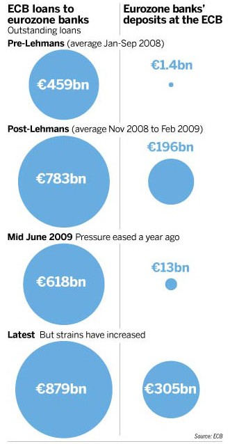 No obstante, casi el 40% de este dinero se deposita nuevamente en el BCE pese a la exigua remuneración que ofrece este organismo (interés del 0,25%) respecto al interbancario (Euribor, superior al 1,2%). Antes de la crisis de Lehman, los depósitos a la vista en el BCE se situaban, normalmente, por debajo de los 10.000 millones de euros. Es decir, casi 30 veces menos que los niveles actuales.