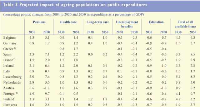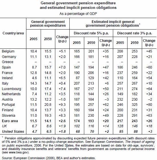 Algunos informes muestran el drama financiero de las cuentas públicas. Tan sólo en este ámbito, la deuda pública comprometida en pensiones ascendía al 147% del PIB en 2005, según la Comisión Europea (CE). El problema es que el coste del sistema público de pensiones seguirá en ascenso durante las próximas décadas, hasta alcanzar, como mínimo, el 194% del PIB en 2050 (un 30% más), según estas mismas estimaciones.