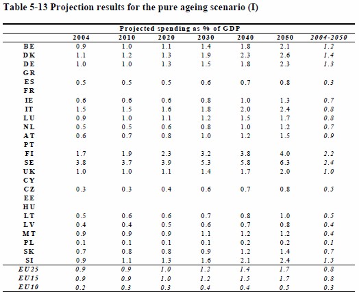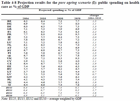 A este coste extra se suma, además, el creciente gasto público en sanidad y dependencia (cuidado de los mayores como, por ejemplo, servicios sociales o residencias públicas). La CE estima que el gasto de la sanidad pública en España pasará del 6,1% en 2004 al 8,3% del PIB en 2050 (un 36% más), mientras que el gasto en servicios sociales como consecuencia del envejecimiento poblacional subirá del 0,5% del PIB en 2004 al 0,8% en 2050 (un 60% más).