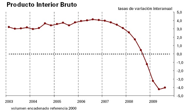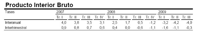Con la caída del PIB en un 4% en el tercer trimestre, ya son cuatro los trimestres consecutivos en los que la economía española registra tasas interanuales negativas, tras los retrocesos del 1,2%, 3,2% y 4,2% experimentados en el cuarto trimestre de 2008, y primer y segundo trimestre de 2009, respectivamente. Asimismo, esta contracción del 4% contrasta con el avance del 0,5% que registró el PIB español en el tercer trimestre del año pasado.
