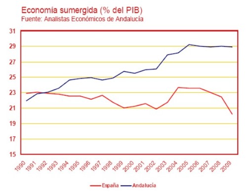 Sin embargo, en Andalucía, a partir de 1992 la economía sumergida va ganando peso progresivamente, hasta alcanzar el 28,9% en 2009, valor muy superior al que se obtiene para el conjunto de la economía nacional. De cada tres euros que se mueven en Andalucía uno es "negro". La gestión socialista de la economía andaluza no sólo no ha reducido la economía sumergida sino que la potenciado. Lea el Informe de Analistas Económicos de Andalucía