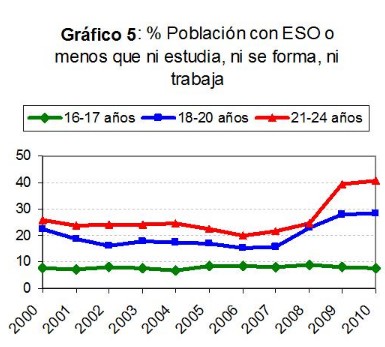 De hecho, la crisis está multiplicando el volumen de jóvenes sin estudios secundarios post-obligatorios que ni estudian ni trabajan. En concreto, el 30% entre los jóvenes de 18 a 20 años se encuentra ya en esta situación, mientras que esta tasa asciende al 40% de los jóvenes comprendidos entre los 21 y 24 años.