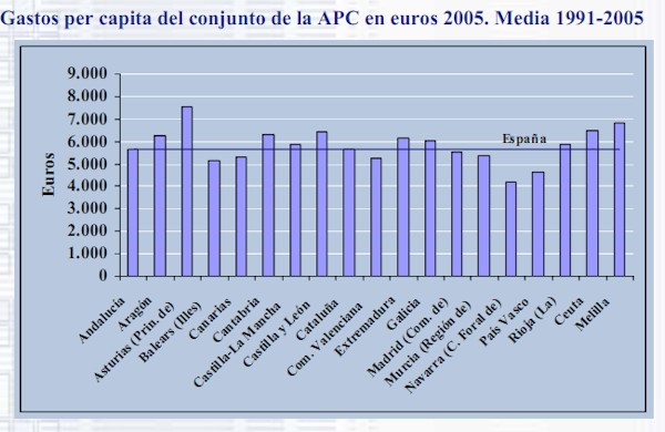 En el gráfico 2 puede verse que el gasto per cápita de la Administración Central ha sido bastante homogéneo entre todas las regiones (sólo sobresale algo Asturias, seguramente por su alto porcentaje de población de avanzada edad).