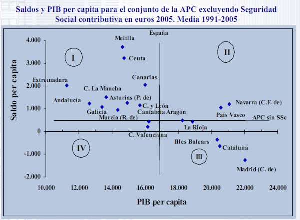 Según puede verse en el gráfico 4, las regiones más ricas reciben menos y las más pobres, al contrario. Se podría trazar una línea casi recta entre el cuadrante I y el III del gráfico sin que ninguna región se alejase mucho. Sólo País Vasco y Navarra, por la especial naturaleza de su régimen foral, escapan a esta tendencia.