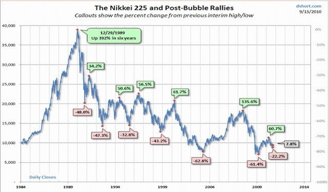 Algo similar ocurre con la bolsa. Pese a las intensas y constantes intervenciones del Gobierno nipón, a base de inyecciones masivas de liquidez y gasto público, la bolsa japonesa ha registrado una tendencia a la baja desde 1990, momento en el que estalló su burbuja crediticia. La evolución de su principal índice (Nikkei), en forma de sierra, muestra que la reacción del mercado a las acciones públicas tan sólo surten un efecto limitado a muy corto plazo. La caída ha sido constante desde entonces.