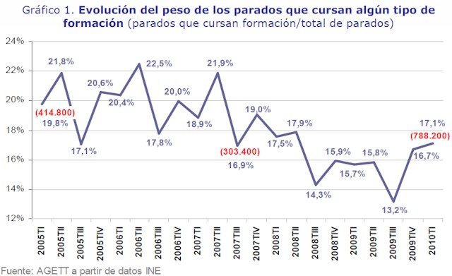 Por otro lado, en España tan sólo 788.200 de los 4,6 millones de desempleados registrados en el primer trimestre de 2010 realiza algún tipo de formación, esto es, el 17,1% de los parados. Aún así, se han incrementado en un 160% desde que comenzó la crisis (485.000 personas más). Tan sólo en los últimos seis meses 244.700 desempleados han decidido formarse para poder conseguir un empleo.