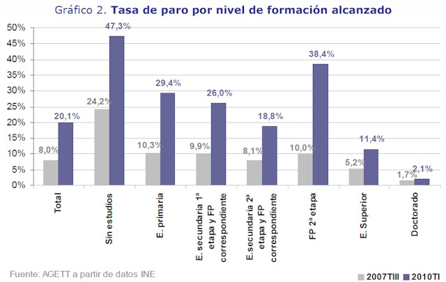"Las personas con baja cualificación (sin estudios y con educación primaria) son los que más han visto crecer su número de parados" durante la crisis, indica el documento. Por el contrario, los trabajadores con unos niveles de formación elevados son los que menos están sufriendo el drama del desempleo: los que poseen un título de doctorado registran una tasa de paro del 2,1%; seguidos de los que cuentan con educación superior (11,4%); el colectivo con título de secundaria o equivalentetambién posee una tasa por debajo de la media, con un 18,8%.