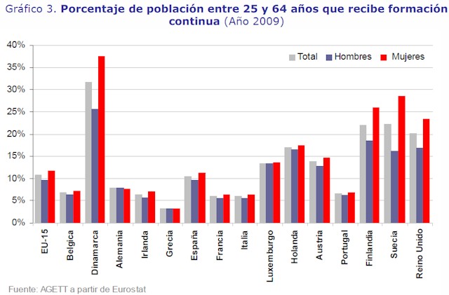 Aranda concluye que "en los países europeos con una menor tasa de paro vemos que la formación está más que asimilada por sus ciudadanos. Hay países que superan el 30% de la población entre 25 y 64 años que realiza formación continua (life-long learning), mientras España apenas alcanza el 11%, lo que nos hace intuir que la menor incidencia de la crisis en sus mercados laborales no ha sido fruto de la casualidad sino, más bien, de una mayor protección de sus empleos gracias al aprendizaje continuo de los trabajadores".