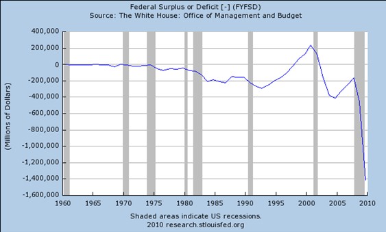 Y estas advertencias no son para menos, dado que la Administración Obama parece empeñada en superar todos los records históricos referentes al gasto y déficit públicos. No en vano, ante los últimos datos de déficit conocidos en EEUU, el mismo secretario del Tesoro, Tim Geithner, ha reconocido que son “altamente insostenibles”. El siguiente gráfico ilustra bien esta realidad, con una línea que parece no encontrar suelo.