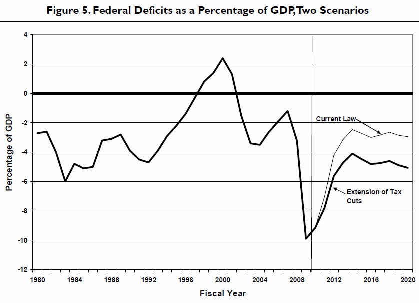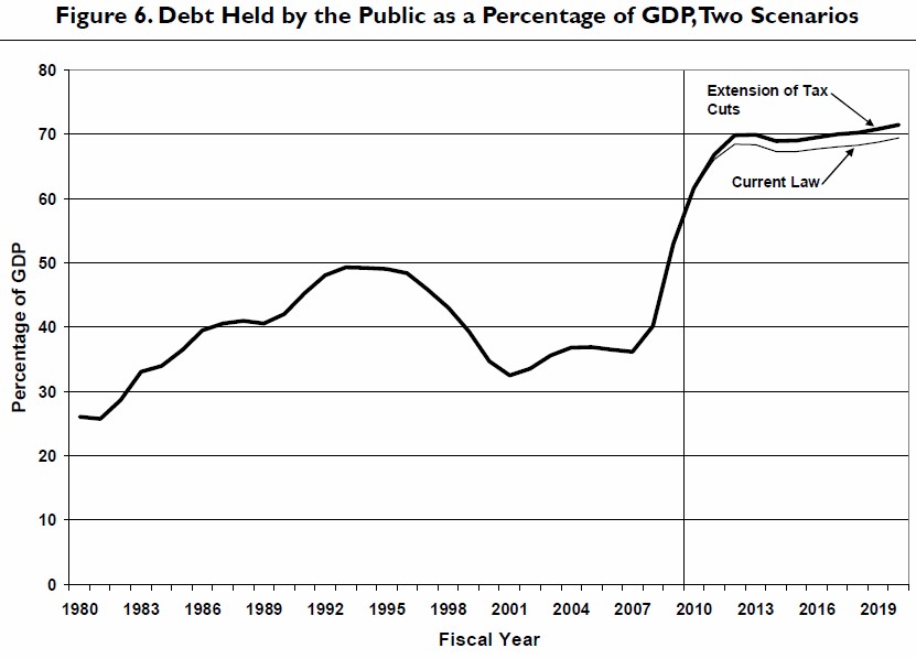 El informe del CBO destaca que la permanencia de las rebajas fiscales de Bush y el mantenimiento de la actual estructura de gastos supondrá un coste adicional de 5 billones de dólares (cinco veces el PIB anual de España) en los diez próximos años.