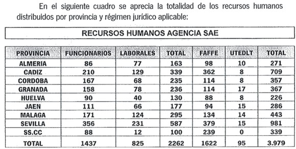 Lo corrobora el Diario de Sevilla que añade que "la nueva Agencia Especial de Empleo que ultima la Junta de Andalucía aglutinará a 3.979 trabajadores del sector público, al integrar a los 2.262 funcionarios y laborales del Servicio Andaluz de Empleo (SAE) con los 1.622 empleados -número no revelado nunca por la Administración andaluza - pertenecientes a la Fundación Andaluza Fondo Formación y Empleo (Faffe) y otros organismos. Esta plantilla es la que prevé la Consejería de Empleo para la agencia especial que a partir del próximo año gestionará las políticas activas de empleo en la comunidad, según un borrador de la Administración andaluza al que tuvo acceso esta redacción."