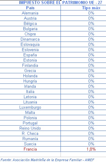 La Asociación Madrileña de la Empresa Familiar (AMEF) ha realizado un pequeño estudio sobre esta figura impositiva en el que recuerda que desde 1994 en la UE sólo se ha legislado sobre este tema para abolir el Impuesto de Patrimonio. Sólo Francia lo mantiene (con un tipo del 1,8%) e incluso en el país galo su Senado se ha pronunciado ya para definir este impuesto como un "arcaísmo fiscal".