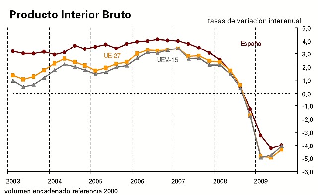 Con la caída del PIB en un 4% en el tercer trimestre, ya son cuatro los trimestres consecutivos en los que la economía española registra tasas interanuales negativas, tras los retrocesos del 1,2%, 3,2% y 4,2% experimentados en el cuarto trimestre de 2008, y primer y segundo trimestre de 2009, respectivamente.