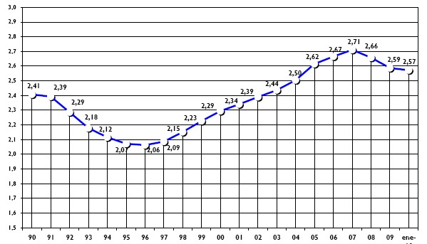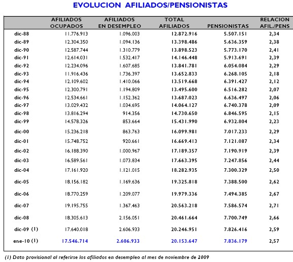 Además, la intensa destrución laboral que sufre el país desde el inicio de la crisis tiene importantes implicaciones para la sostenibildiad del sistema de pensiones a largo plazo. Así, el ratio entre ocupados y pensionistas desciende hasta 2,57 (2,57 afiliados por pensionista), el peor nivel desde mediados de 2004.