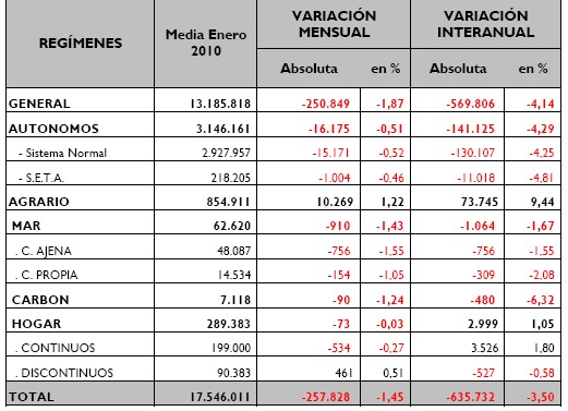 Con los descensos de enero, el Régimen General acumula seis meses seguidos en negativo, mientras que el RETA ya lleva 21 meses perdiendo afiliados. Al finalizar el mes pasado, el Régimen General contaba con 13.185.818 cotizantes de media, 569.806 menos que un año atrás (-4,1%), mientras que al RETA estaban afiliados 3.146.161 trabajadores, 141.125 menos en comparación con enero de 2009 (-4,29%), informa Europa Press.