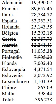 La factura de Grecia (110.000 millones), Irlanda (en principio, 85.000 millones) y Portugal (unos 51.500 millones de euros) sumarían un total de 250.000 millones de euros, aproximadamente. Irlanda ha sido el primer país en acudir al Fondo, ya que Grecia fue rescatada pocos días antes de su creación (9 de mayo).