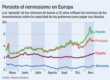 El dilema que se plantea es el siguiente: tras el rescate griego e irlandés, los inversores ya están descontando la quiebra y consiguiente salvamento de Portugal; el siguiente sería España, según refleja el mercado de credit default swaps (CDS), un seguro para cubrir pérdidas derivadas de impagos (default), en caso de que el Gobierno socialista no cumpla las promesas anunciadas en mayo, no aplique nuevos recortes y no ponga en marcha las serias y profundas reformas estructurales de liberalización precisas para impulsar el crecimiento. Por el momento, la ministra de Economía, Elena Salgado, insiste en que no son necesarias nuevas medidas, de ahí la creciente tensión que vive últimamente la deuda pública española; y tras España se sitúa Italia, completando así las lista de los denominados (PIIGS), los países periféricos, los más débiles de la zona euro.