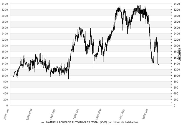 Como puede observase en el gráfico, si se representan las matriculaciones por millón de habitantes la imagen es aún peor, ya que nos encontramos en cifras similares a las de 1973, ligeramente por debajo de los 1.400 automóviles/mes, y muy por debajo del promedio de 3.000 automóviles/millón de habitantes/mes que tuvimos desde 2000 hasta 2007.
