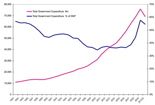 El Gobierno irlandés, al igual que el español, aprovechó los ingresos boyantes del periodo de auge económico para financiar un gasto público que crecía con gran alegría, como se observa en el siguiente gráfico que aporta Mitchells.