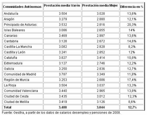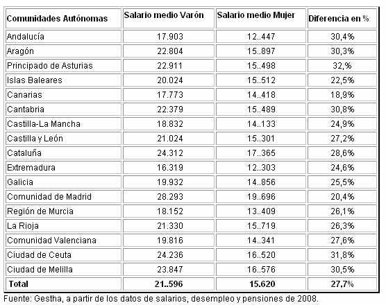 Las mujeres andaluzas cobran sueldos un 30,4 por ciento inferiores a los de los hombres, según las estimaciones realizadas por los Técnicos de Hacienda (Gestha) a partir de los datos de IRPF correspondientes a 2008. Todavía es peor la situación en el Principado de Asturias la región que registra mayores diferencias de sueldo por sexos, ya que ellas cobran un 32,4 por ciento menos, siguiéndoles de cerca las mujeres cántabras, que perciben unos ingresos de un 30,8 por ciento menos; y las madrileñas, que comparten con las andaluzas la cifra del 30,4 por ciento. A sólo una décima, se encuentran las aragonesas, con un 30,3 por ciento menos de salario que los varones.