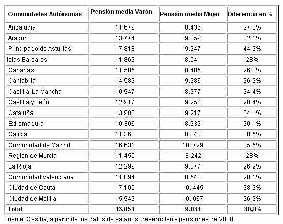 Naturalmente, el informe indica que llegada la edad de la jubilación las diferencias siguen existiendo. Extremadura registra unos ingresos de las mujeres más próximos a los de los hombres aunque, pese a ello, ellas cobran un 20,1 por ciento menos. Esta comunidad está seguida de Castilla-La Mancha (24,4 por ciento menos), La Rioja (26,2 por ciento menos), Canarias (26,3 por ciento menos) y Galicia (26,6 por ciento). Por su parte, comunidades como Andalucía (27,8 por ciento menos), Islas Baleares (28 por ciento), Murcia (28 por ciento), la Comunidad Valenciana (28,2 por ciento) y Castilla y León (28,4 por ciento), registran diferencias intermedias entre las pensiones que perciben ellos y ellas al final de su vida laboral. En las últimas posiciones están la Comunidad de Madrid (35,5 por ciento menos), Cantabria (35,7 por ciento menos) y nuevamente Asturias (un 44,2 por ciento menos).