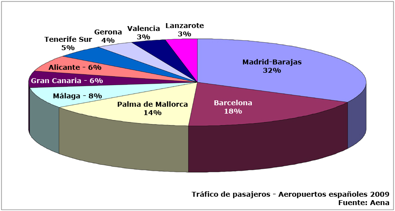 El aeropuerto madrileño carga con un tercio del tráfico nacional. Otro tercio se lo reparten entre Barcelona y Palma de Mallorca, y el resto una decena de aeropuertos públicos repartidos por las áreas turísticas de Canarias, Baleares y las costas Brava y del Sol. Los aeropuertos del resto de España tienen un tráfico realmente pequeño. Aeropuertos de ciudades grandes como el de Zaragoza apenas llegaron al medio millón de pasajeros y las 13.000 operaciones.